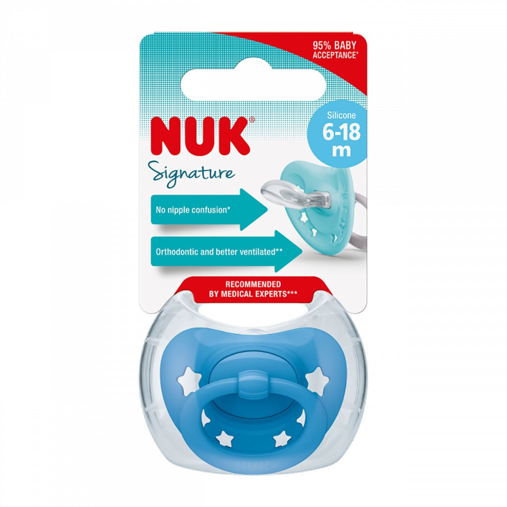Baba cumi NUK Signature 6-18 hónapos babák számára. A cumi szimmetrikus, amely tekintettel van a szájpadlás, a fogak és az íny természetes fejlődésére. Nagyon minőségi műanyag és szilikonból készült. Szagtalan és könnyen tisztítható. Nem tartalmaz BPA-t. Minden NUK cumi rendszeresen tesztelve és ellenőrizve van a független intézetekkel.