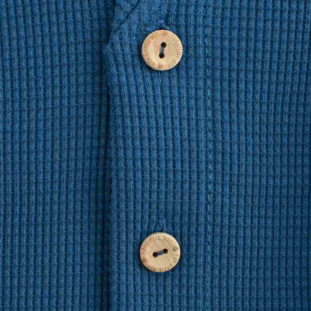 New Baby Oliver elegáns baba kabát – kardigán. A V-alakú nyakkivágású fiúkabát praktikus gombos rögzítéssel rendelkezik. A gyönyörű fa gombok elegáns megjelenést kölcsönöznek