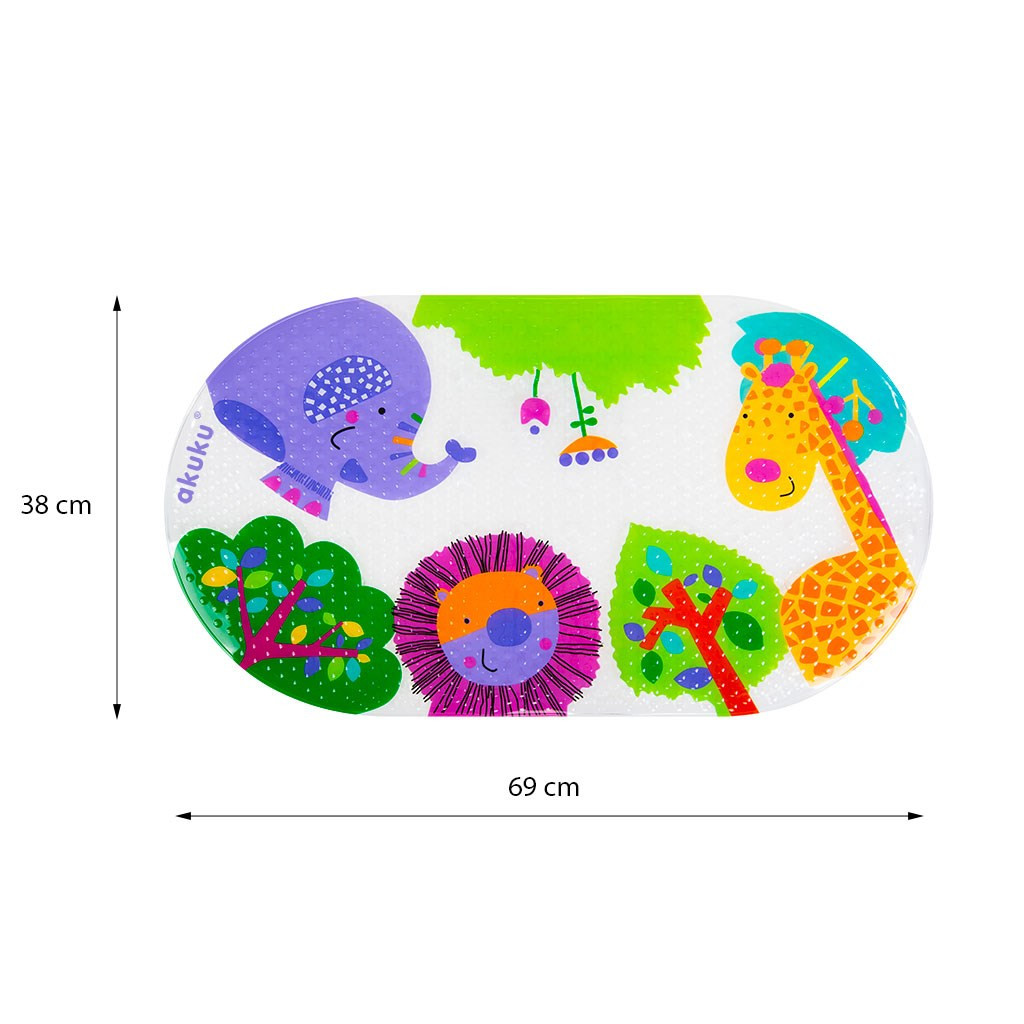 Az „akuku” csúszásgátló fürdőszőnyeg babakádba, normál kádba és zuhanykabinba egyaránt használható. Biztonságot nyújt fürdés közben. A színes minta vidámabbá teszi a mindennapi tisztálkodást.