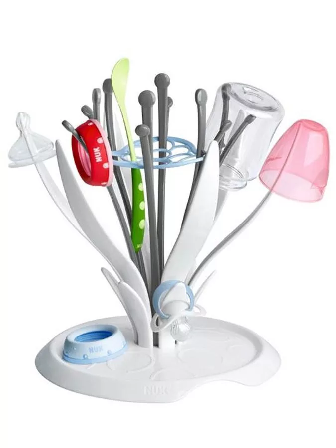 Cumisüveg szárító és kiegészítők NUK. Ideális szárítója a cumisüvegeknek, cumiknak, evőeszközöknek és egyéb kiegészítőknek. 6 üvegnek alkalmas. Divatos virág alakú. Mosogatógépbe tisztítható.