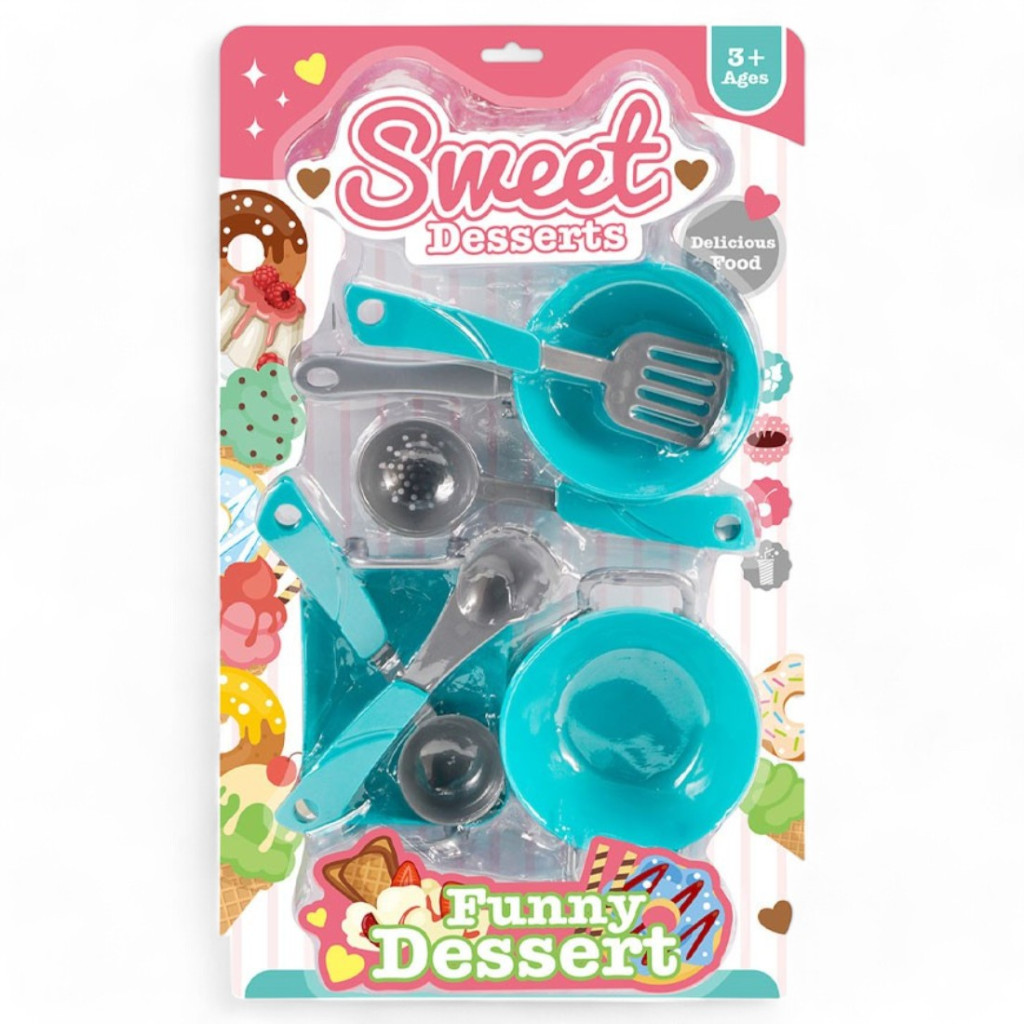 Edény klt., edények + eszk., 2 féle, kék, 24x40 cm lapon