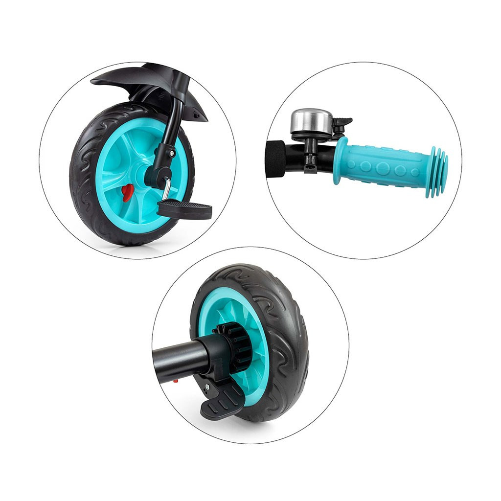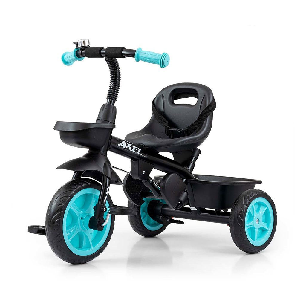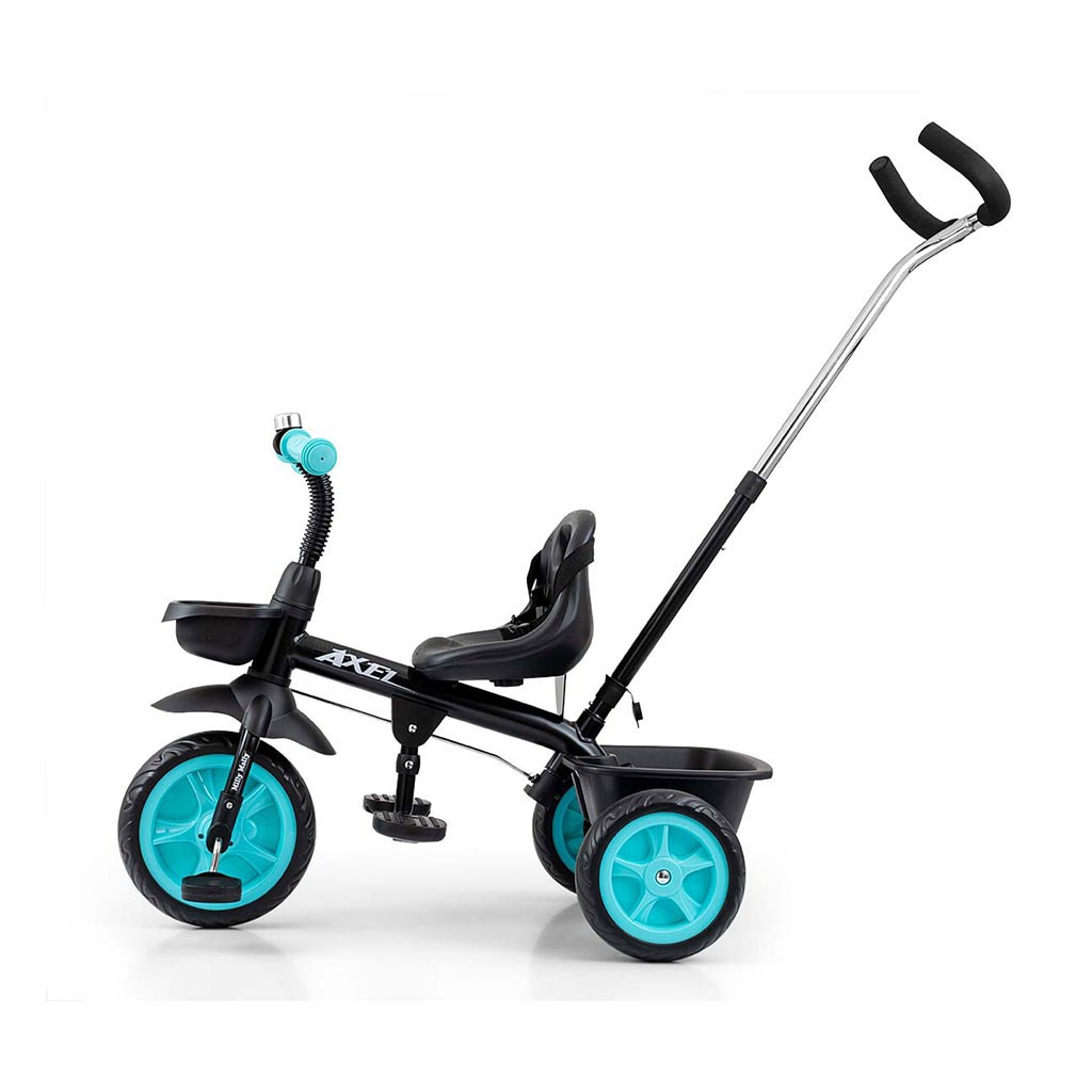 Gyerek pedálos, háromkerekű bicikli Milly Mally Axel. 1-3 éves gyermekek számára gyártott. Minőségi és tartós anyagokból készül. Kényelmes és ergonómikusan kialakított üléssel rendelkezik, amelynek távolsága a kormánytól könnyen beállítható, így a tricikli a gyermek korához és magasságához igazodik. A tricikli a GROW UP csoport termékei közé tartozik, tehát gyermekével növekszik. Az első keréknél kioldható a pedálhajtás, és a vezetőkar segítségével lehet a triciklit vezetni. Keményített EVA habból készült széles kerekek garantálják a kényelmet és a tartósságot bármilyen felületen. A maximális gyermekbiztonság érdekében a tricikli hárompontos biztonsági övvel rendelkezik.