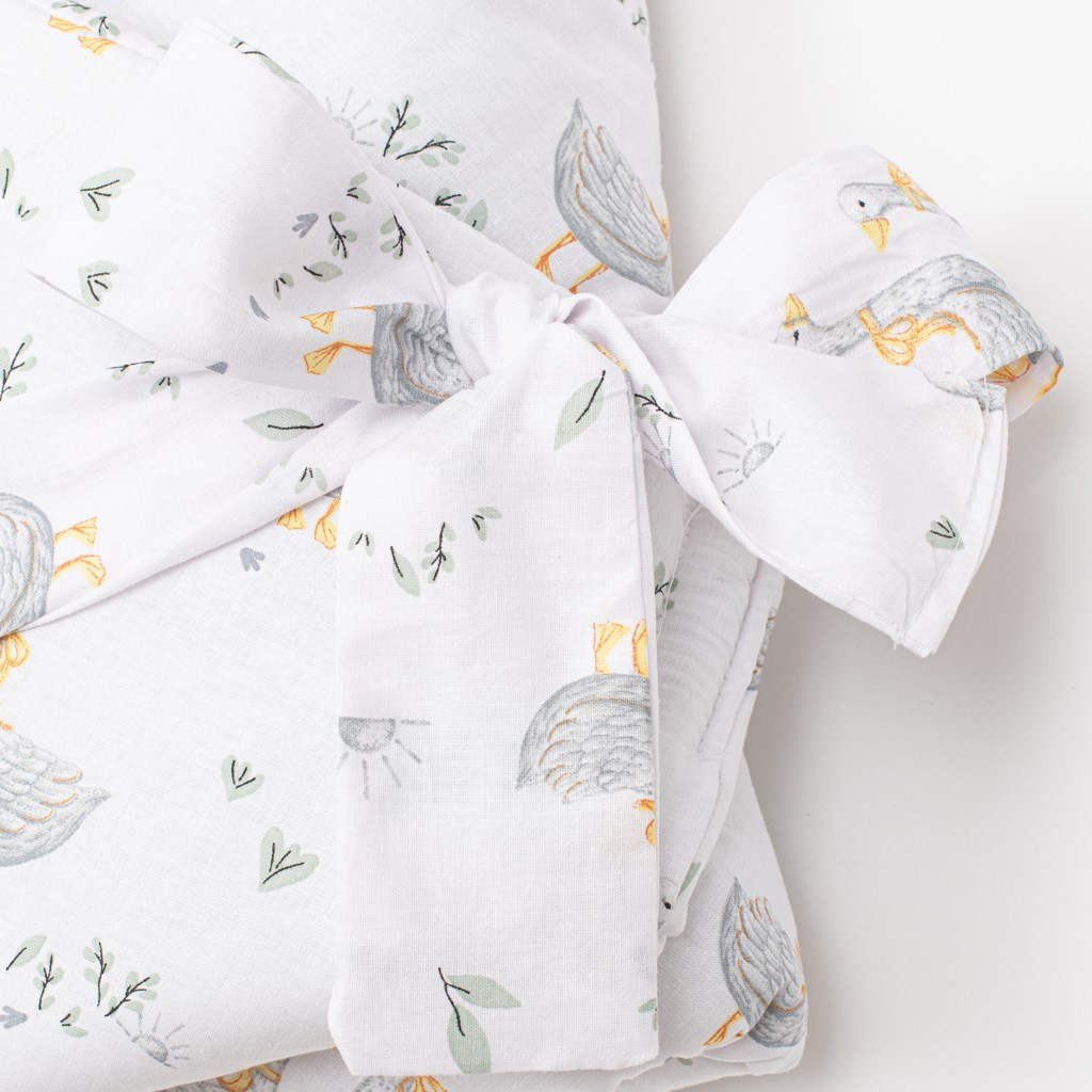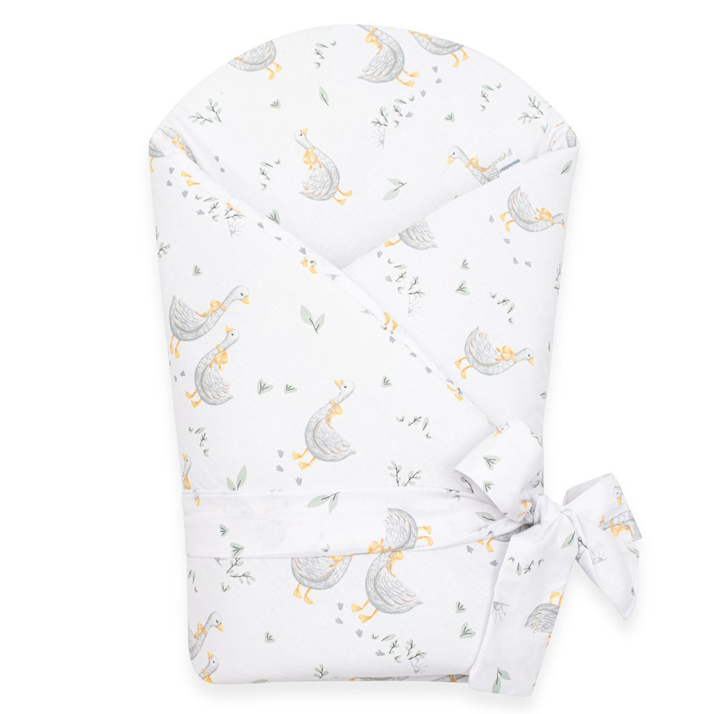 Aranyos baba pólyakendő New Baby Libák. Gyönyörű gyermekmotívum aranyos kis libákkal, gyönyörködtetni fogja a gyermekszemeket. Puha minőségi anyagból készült, ami kellemes melegséget biztosít a baba számára. A pólyakendő tépőzáras. Mérete cca 80x80 cm. Összetétel: huzat 100% pamut, töltőanyag 100% poliészter.