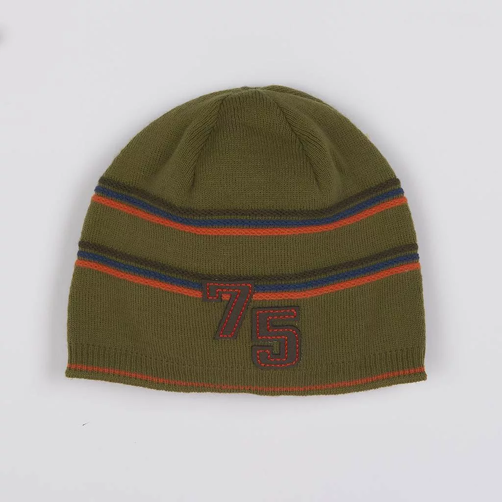 Gyerek sapka. A sapka egyszínű csíkokkal és 75-ös számmal. Anyaga: 100% akril. Mérete: 52-54. Idősebb gyerekek számára is megfelelő.