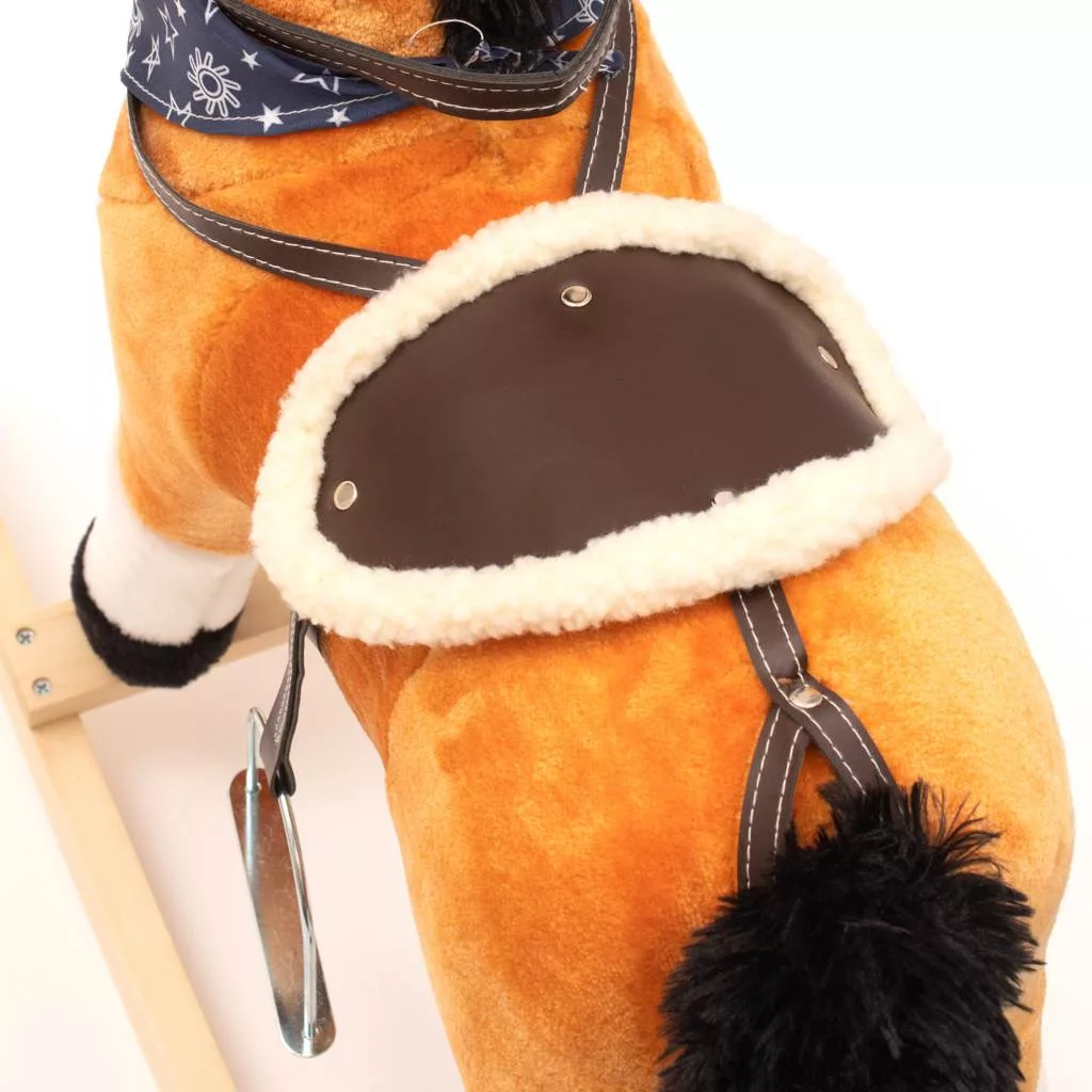 Aranyos hintaló sállal a nyakán. A füle megnyomása után a lovacska mozgatja a farkát és a száját, hangokat ad ki, vagy dallamokat játszik. Puha anyagból készült, ezért a gyermekek sokáig élvezhetik a szórakozást. A hintaló nyereggel, kantárral és fa kapaszkodóval rendelkezik. A hintaló fejleszti a mozgáskoordinációt és az egyensúlyérzéket is. Ez a fantasztikus hintaló tökéletes ajándék a gyermeke számára. Az elemtartó a hintaló hasán található.
