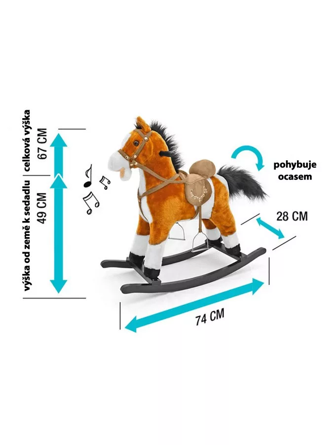 Különösen szép Milly Mally hintaló. A csomagolás nem tartalmazza az elemet (3x AA). A lovacska mozgatja a farkát és nyerít. Kellemes anyag. Nyereggel, fa fogantyúval és lábtartóval felszerelt. A lengő fa keret leszerelhető. Teherbírás: 30 kg. Méretek: cca 67x64x28 cm, a nyereg magassága a földtől cca 49 cm.