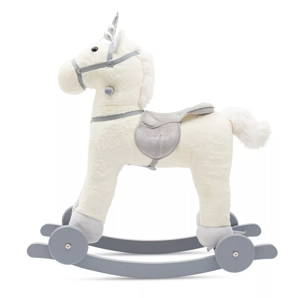 Ez az aranyos fehér hintaló a Baby Mix márkától minden gyermek számára ideális választás. A legkisebbek biztonságára és örömére tervezve nemcsak a hagyományos hintázás élményét nyújtja, hanem a kerekekkel való gurulást is lehetővé teszi. Az erős kerekek révén a ló a padlón mozgatható, ami még változatosabbá teszi a játékot. A beépített dallam tovább fokozza a hintázás élményét, fejleszti a hallást, és ösztönzi a gyermeket az aktív játékra.