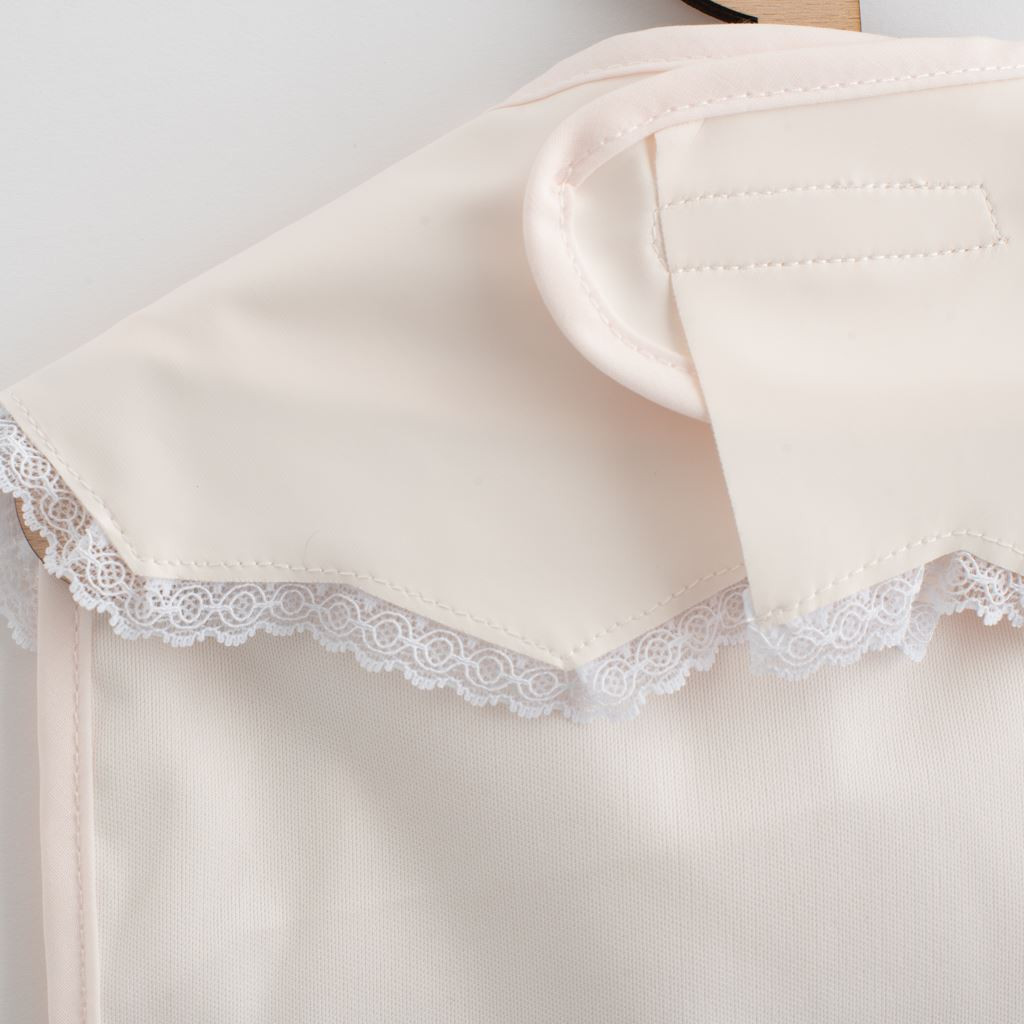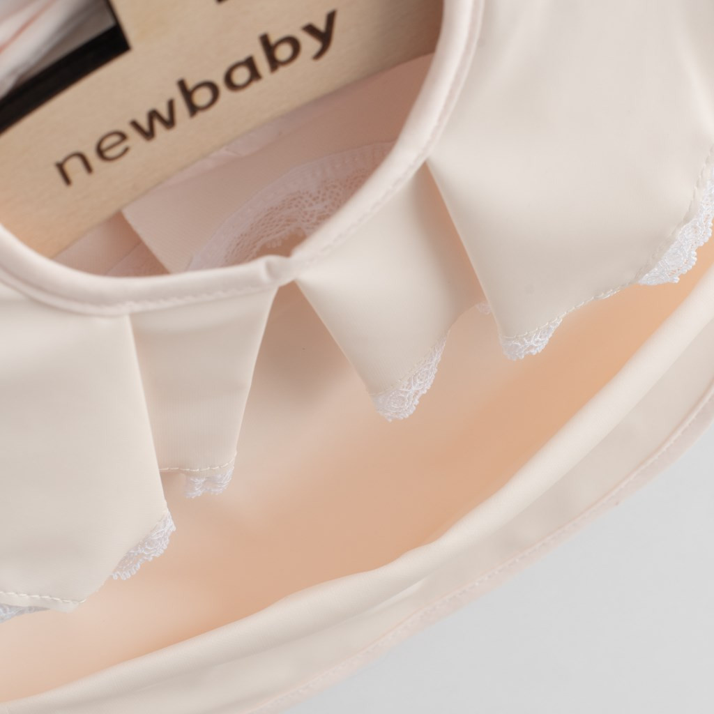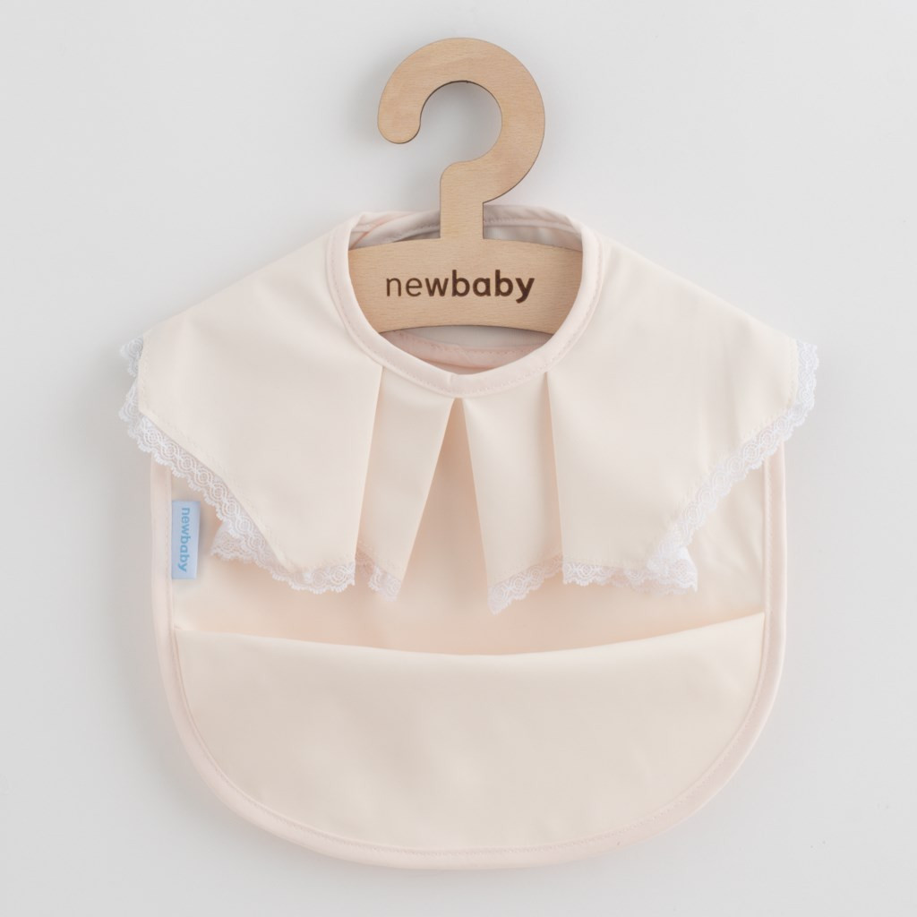 A New Baby luxus csipkés lány előke hatékonyan védi a baba ruháit a piszoktól evés és játék közben. Könnyű, puha és könnyen mosható anyagból készült. Kényelmes tépőzárral és praktikus zsebbel. A zseb két réteg anyagból készült. Az előke nedves ronggyal letörölhető és mosógépben is mosható.