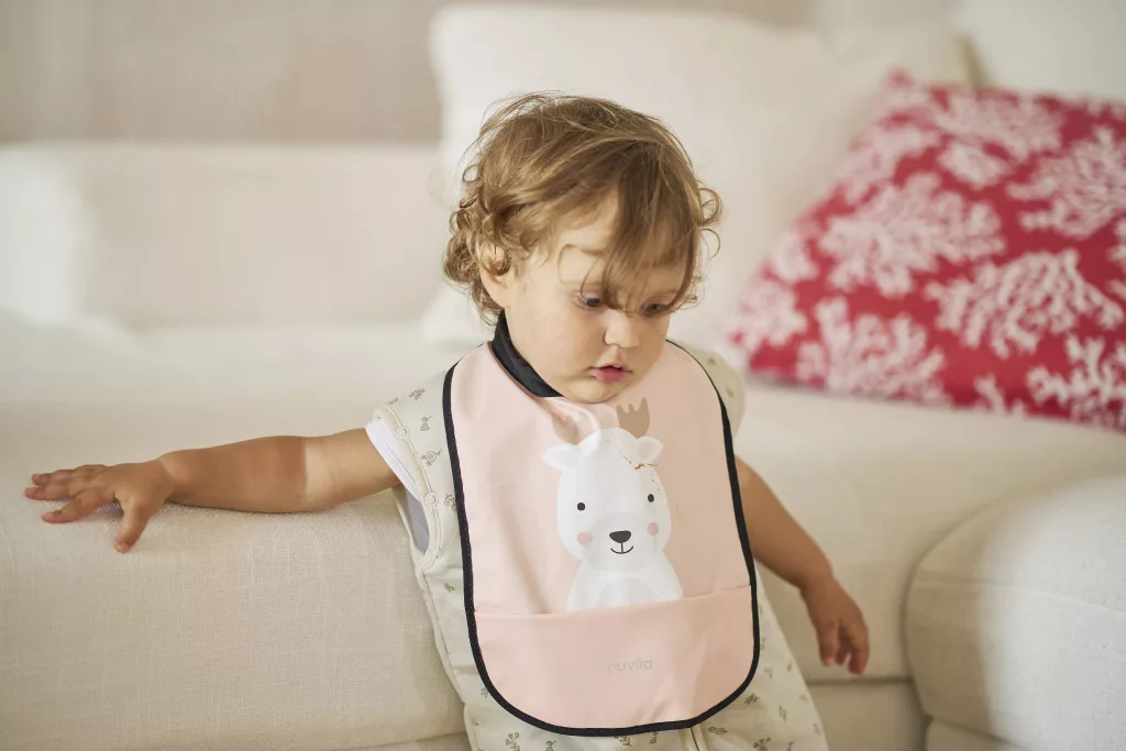 Vízlepergető anyagból készült, vidám mintás előke, amely kényelmes viselet, nem irritálja a gyerek bőrét.