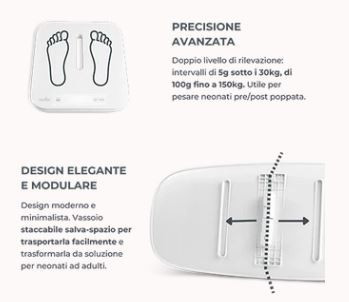 AZ EGÉSZ CSALÁD SZÁMÁRA: minden tag létrehozhat egy személyes profilt az alkalmazásban, hogy figyelemmel kísérhesse súlyát. Az integrált mesterséges intelligenciának köszönhetően a dedikált alkalmazáson keresztül rögzíti és elemzi a súly- és magasság adatokat, összehasonlítja azokat hitelesített egészségügyi paraméterekkel, és hasznos információkat közöl az egészségi állapotról. 2 érzékelési szint a maximális pontosság érdekében: 5 g-os intervallumok 30 kg alatti és 100 g-os intervallumok 150 kg-ig.