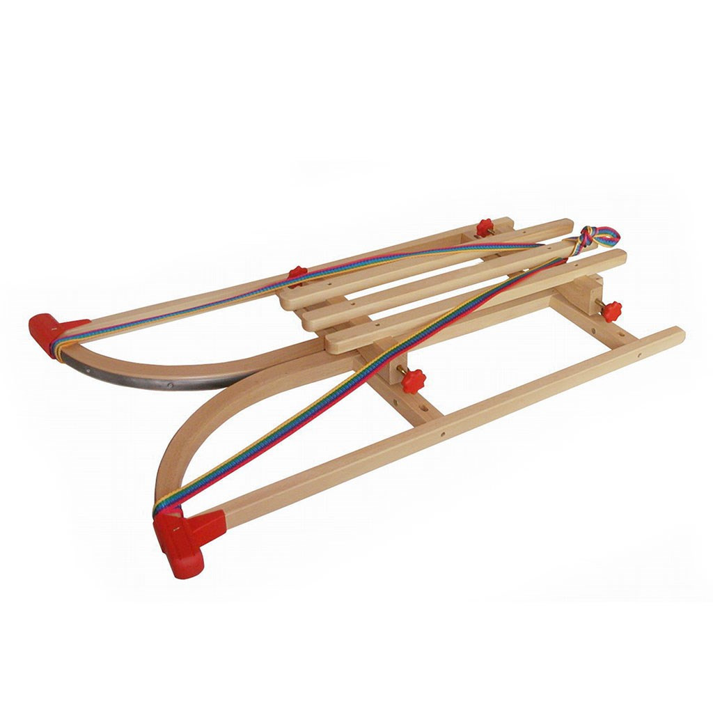 Erős és tartós fa összecsukható szánkó bükkfából készült és színtelen átlátszó lakkal van ellátva, melynek köszönhetően a fa megőrzi tartós színét. Az egyszerű és biztonságos összecsukási rendszernek köszönhetően a szánkó összecsukva nagyon kevés helyet foglalnak el (csak 9 cm magas). A rozsdamentes acél talpja növeli a tartósságot és kényelmet szánkózás közben. A szánkó eleje speciális védővel rendelkezik. Kötéllel felszerelt.