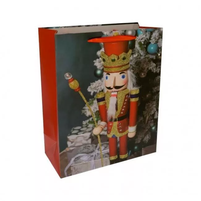 Papírtasak, diótörõvel, glitteres, piros, arany, XM, 18x23x10 cm