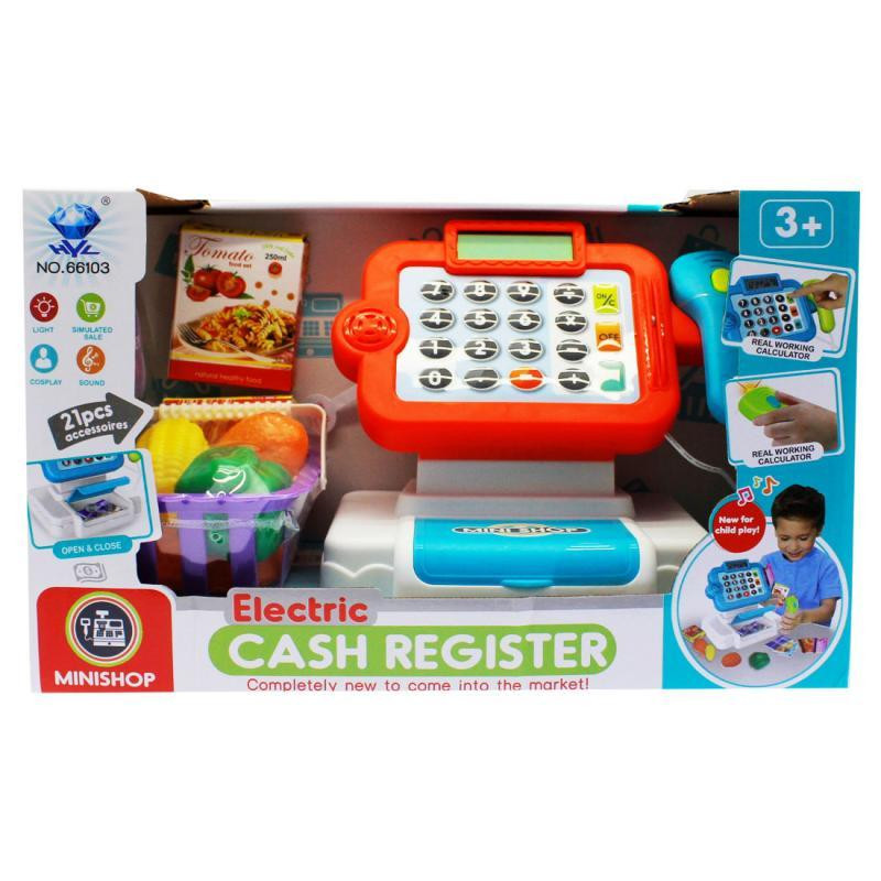 Pénztárgép klt., el., hang+fény, LCD kijelzõ, számológép, 2 szín, 33x20 cm dob.
