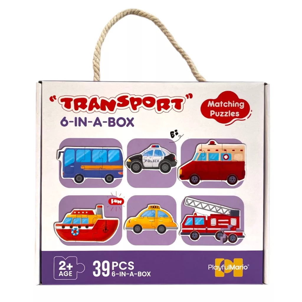 Puzzle, 6 db. jármû, autó kép, 39 db, 25x21 cm hordozó dob.