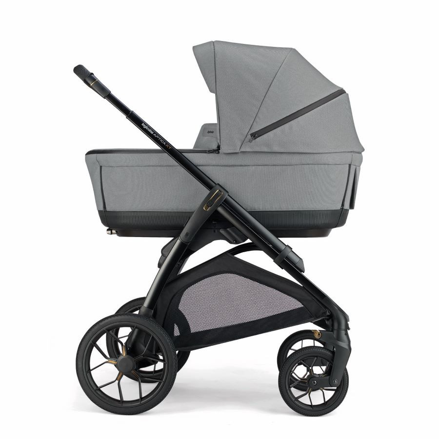 Az új Aptica XT Canyon Grey kombinált babakocsi adaptív felfüggesztéssel, mózeskosárral 5 szellőző ablakkal és új, 1,5 kg-mal könnyebb alvázzal, nagy kerekekkel.