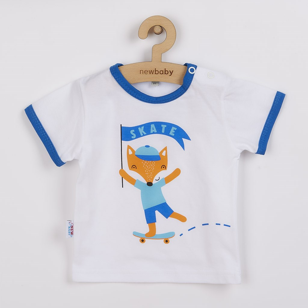 2 részes pamutos együttes New Baby Róka. Az együttes pólót és rövidnadrágot tartalmaz. A póló rövid ujjú és színes szegéllyel van kiegészítve a nyak és az ujjak körül. Vidám róka képpel és SKATE felirattal van díszítve. Vállnál patentos. A rövidnadrág kényelmes, egyszínű és gumis a dereka. Anyaga: 100% pamut.