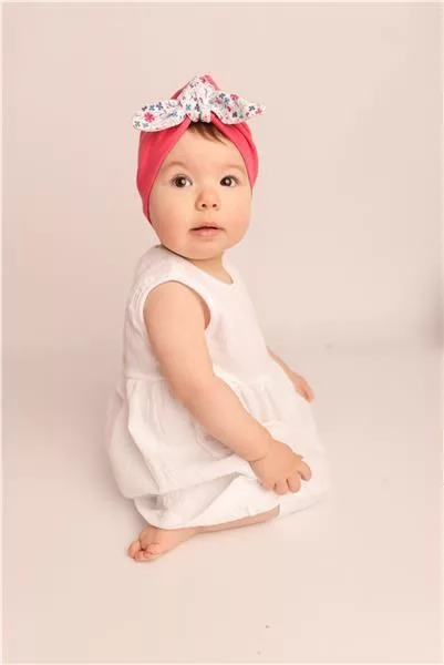 Baba sapka New Baby For Girls. A sapka turbán alakú, szépen alkalmazkodik a baba fején. Szép virágos mintával díszítve. A kollekció nagyon kellemes, puha és minőségi anyagból készült, ami kivételes és fontos a baba elégedettségéhez. Anyag: 100% pamut.