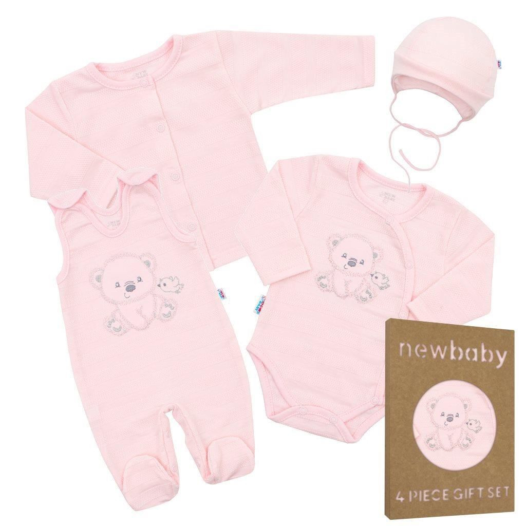 Baba 4-részes együttes Sweet Bear kisbabák számára. Az együttes nagyon jó minőségű kellemes és puha anyagból készült. Hosszú ujjú patentos bodyt, rugdalózót, kabátkát és sapkát tartalmaz. A body teljes hosszában patentos, aranyos maci és madárka képpel díszítve. A rugdalózó aranyos maci és madárka képpel díszítve, vállnál és az ülepénél patentos. A kabátka egyszínű, teljes hosszában patentos. A sapka széles rugalmas szegéllyel rendelkezik. Alakjának köszönhetően a fülek is védve maradnak. A kollekció nagyon kellemes, puha és minőségi anyagból készült, ami kivételes és fontos a baba elégedettségéhez. Az együttes praktikus öko dobozban van csomagolva. Ajándéknak kíválóan alkalmas. Anyag: 100% pamut.