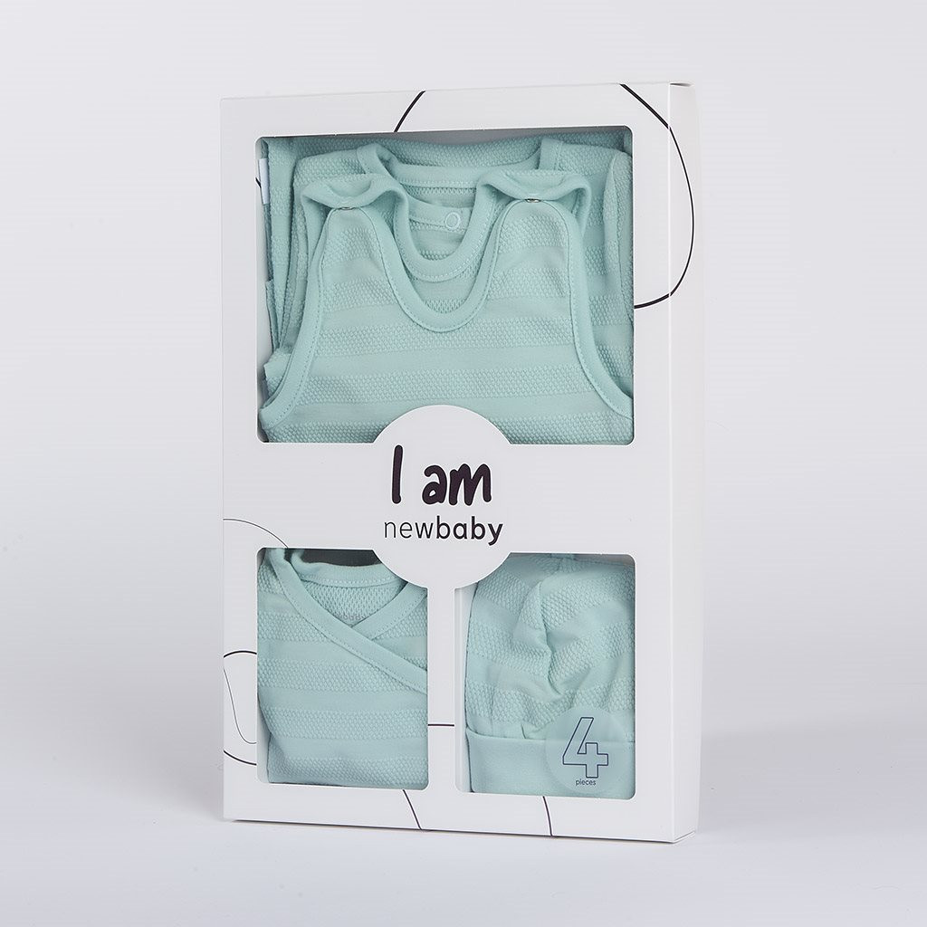 Bájos 4 részes együttes babáknak New Baby I AM. Az együttes nagyon kellemes, puha és kiváló minőségű, csecsemők számára alkalmas anyagból készült, és nem csak újszülött osztályra alkalmas.Tartalma: teljes hosszában patentos, hosszú ujjú body, rugdalózó, felsőrész, sapka. A body oldalán teljes hosszában és az ülepén patentos. A rugdalózó a vállán és az ülepén patentos gombolású, ami megkönnyíti a baba öltöztetését és pelenkázását. A felsőrész teljes hosszában patentos gombolású. A szélesebb szegélyű sapka jól illeszkedik a baba fejére, és nem csúszik le. Nagyon praktikus, és nem nyomja a baba fejét. Egyedi, új dizájnú együttes magával ragadó anyagmintával. A baba igényeit szem előtt tartva készült, ajándéknak is alkalmas. Az együttest praktikus ökodobozban szállítjuk. Összetétel: 100% pamut.