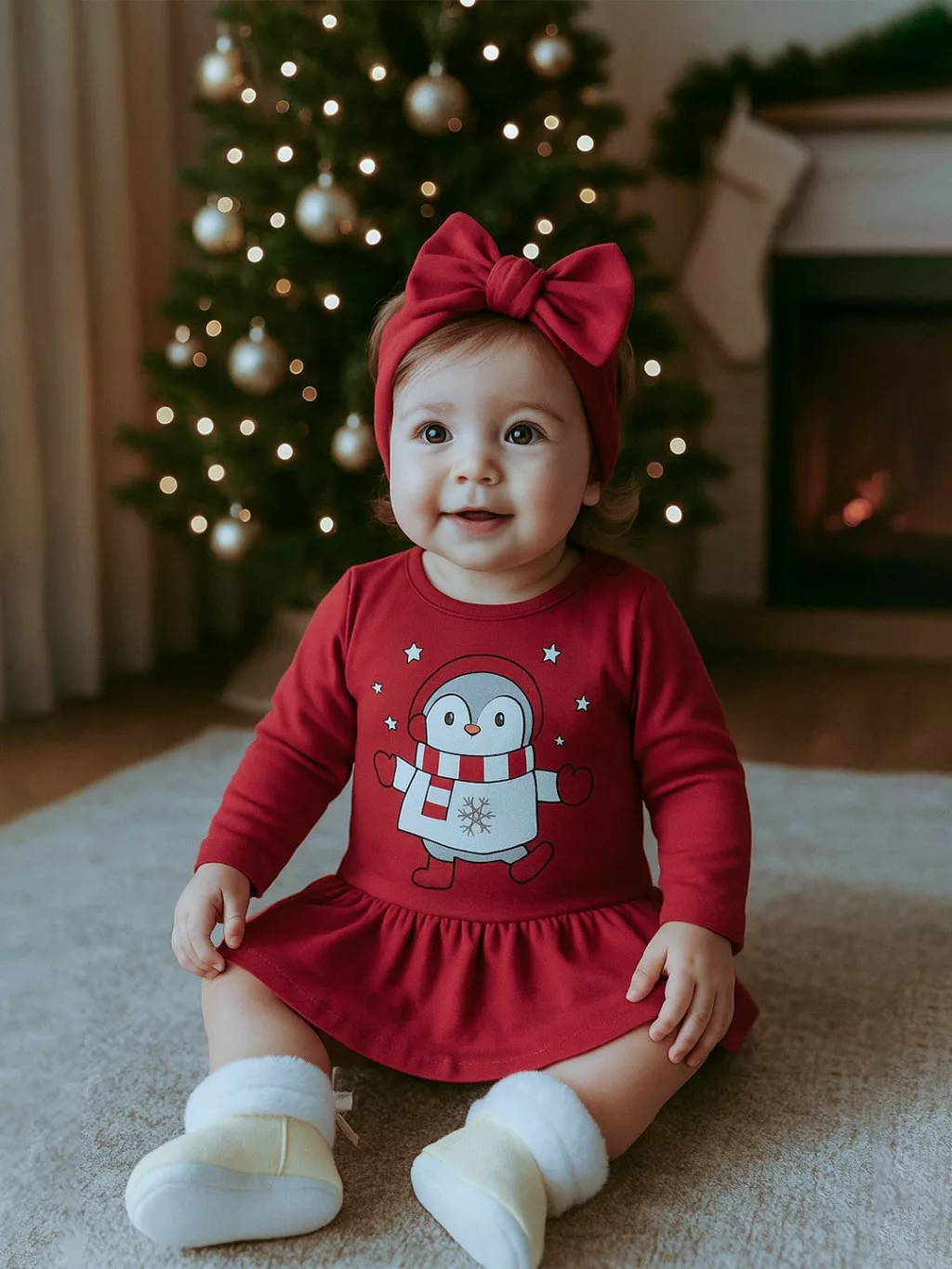 Aranyos, divatos baba ruha fejpánttal New Baby Winter Penguin kishercegnők számára. A alakú ruha aranyos hosszú ujj, piros és az első részén aranyos és vidám pingvin található. Vállnál patentos, ami megkönnyíti a baba öltöztetését. A fejpánt, rugalmas, alkalmazkodó, nagyon kényelmes és jól tart a baba fején. Nagyon kellemes és puha anyagból készült, amelyben a baba nagyon kényelmesen fogja érezni magát. Anyaga: 100% pamut.