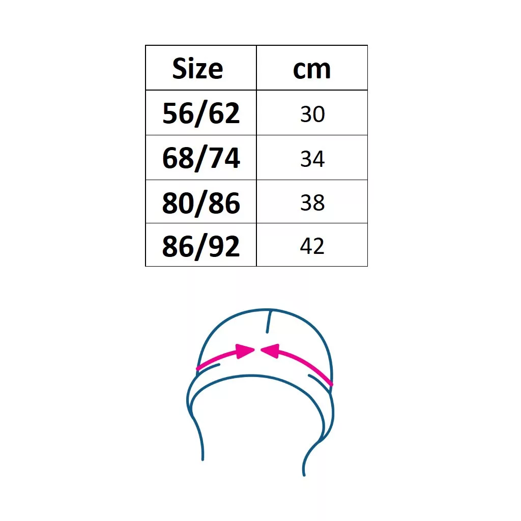 A sapka nem nyomja a fejet, és jól tart a baba fején. Anyagösszetétel: 100% pamut.