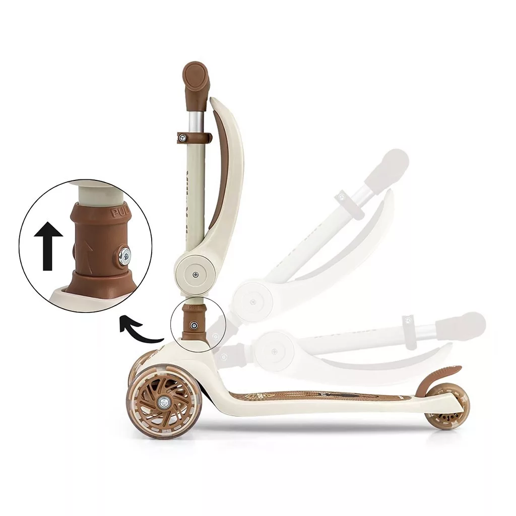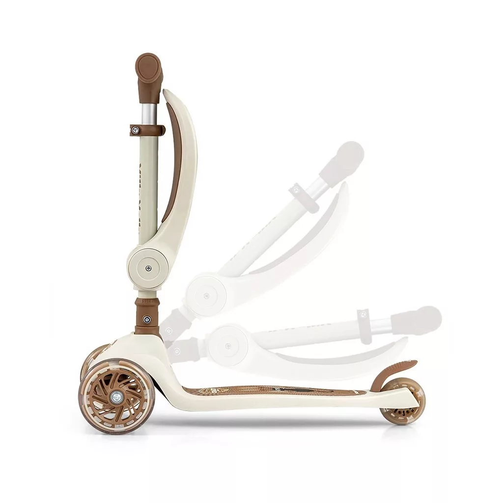A roller együtt nő a gyermekkel. Először üléses futóbicikliként, később klasszikus rollerként használható.